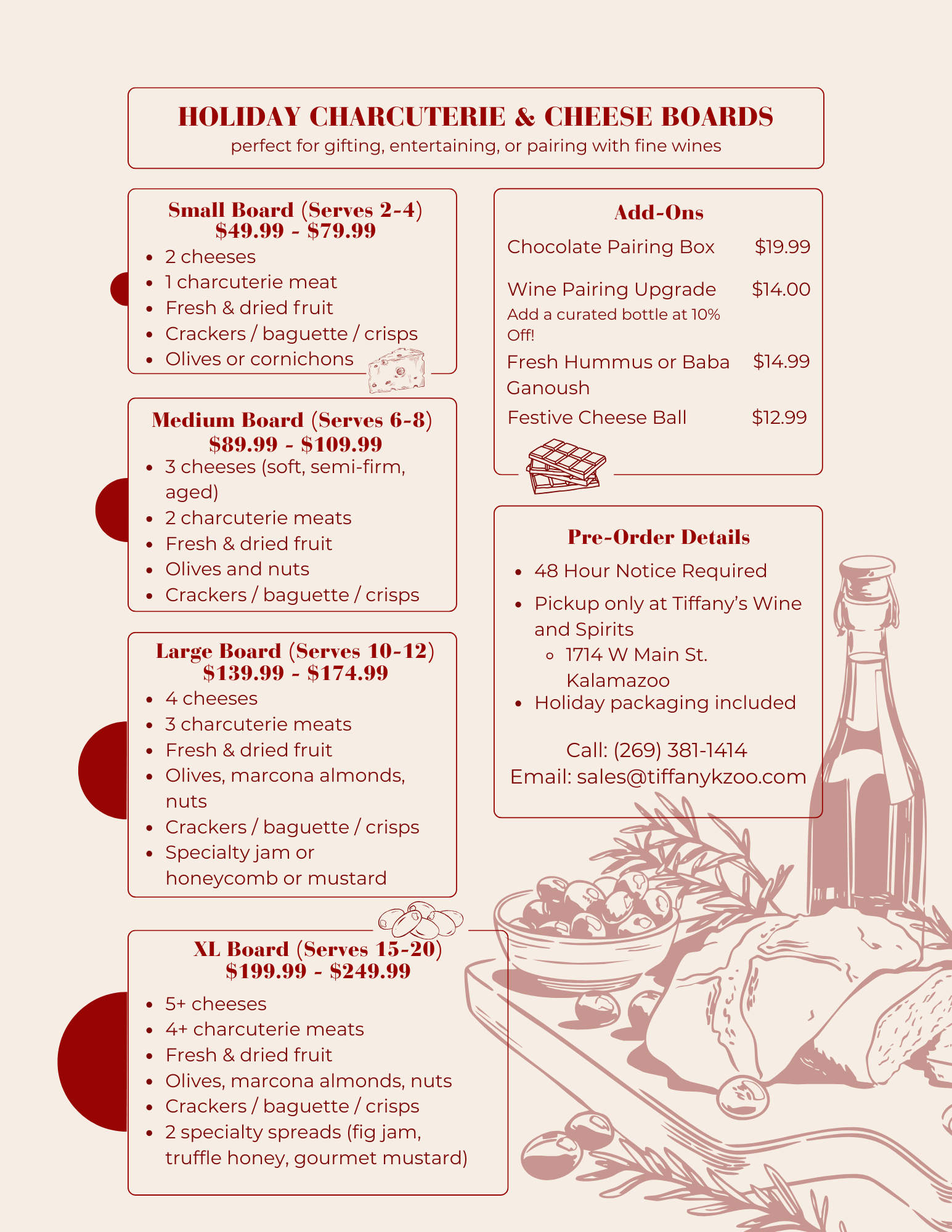 The holidays are all about gathering, celebrating, and indulging — and nothing brings people together quite like a beautifully arranged charcuterie and cheese board. Whether you’re hosting a dinner party, gifting a foodie friend, or simply elevating your cozy night in, Tiffany’s Wine & Spirits has curated the perfect boards for every occasion and group size.