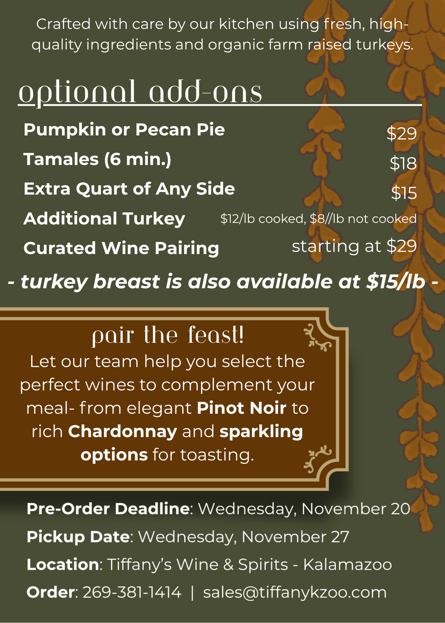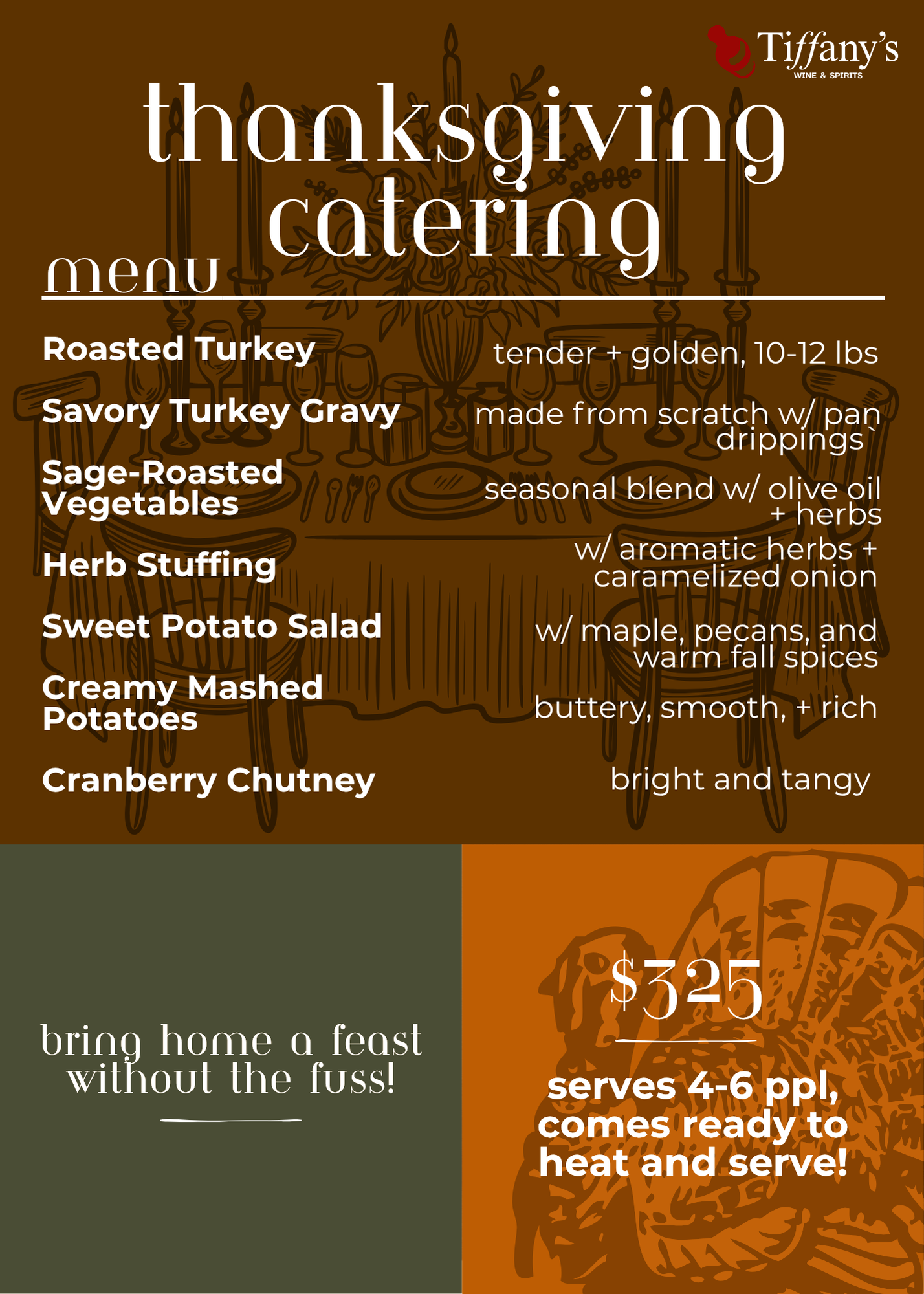 Thanksgiving should be spent gathered around the table — not stuck in the kitchen. This year, let Tiffany’s Wine & Spirits take care of the cooking with our thoughtfully prepared Thanksgiving Catering Meal, crafted with high-quality ingredients and organic, farm-raised turkey. Whether you’re hosting family, welcoming friends, or planning a cozy holiday dinner at home, we make it effortless, delicious, and memorable.
